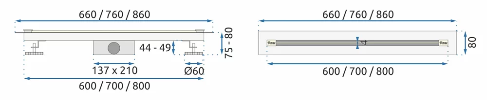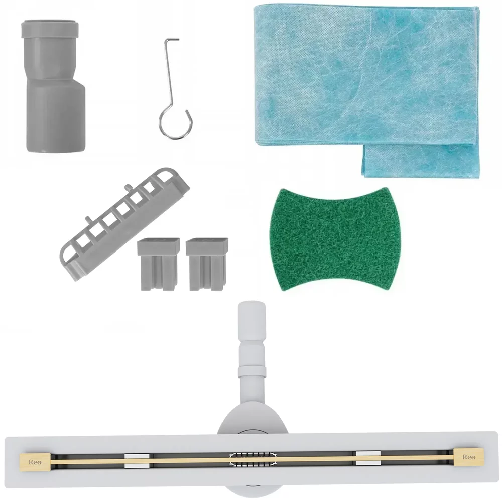 Слив продается в готовом к монтажу комплекте, в который входят: корпус, крышка, регулировочные ножки, сифон, переливной элемент, переходник и гидроизоляционная манжета.