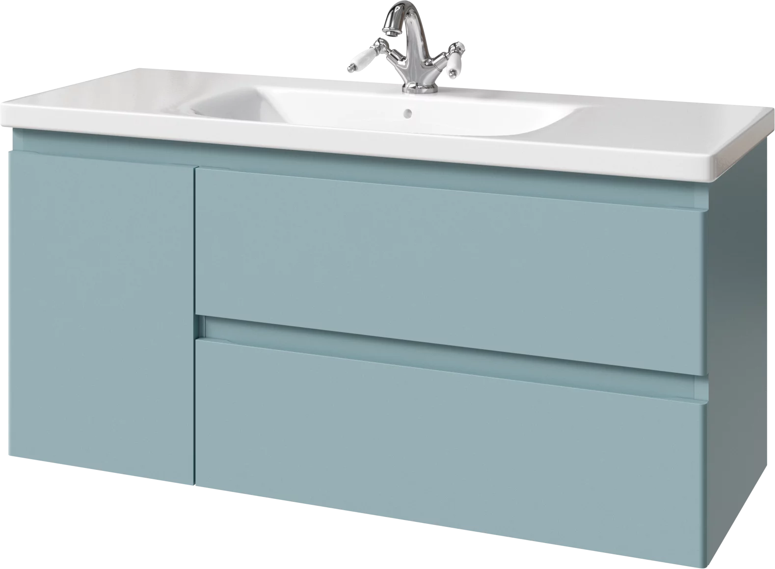 Тумба подвесная для раковины 120 см с 2 ящиками и 1 дверью (слева). Ручки интегрированные в фасадах. Выпускается в Матовых и Текстурированных отделках из реестра MODERN (ограничение по глянцевым отделкам).