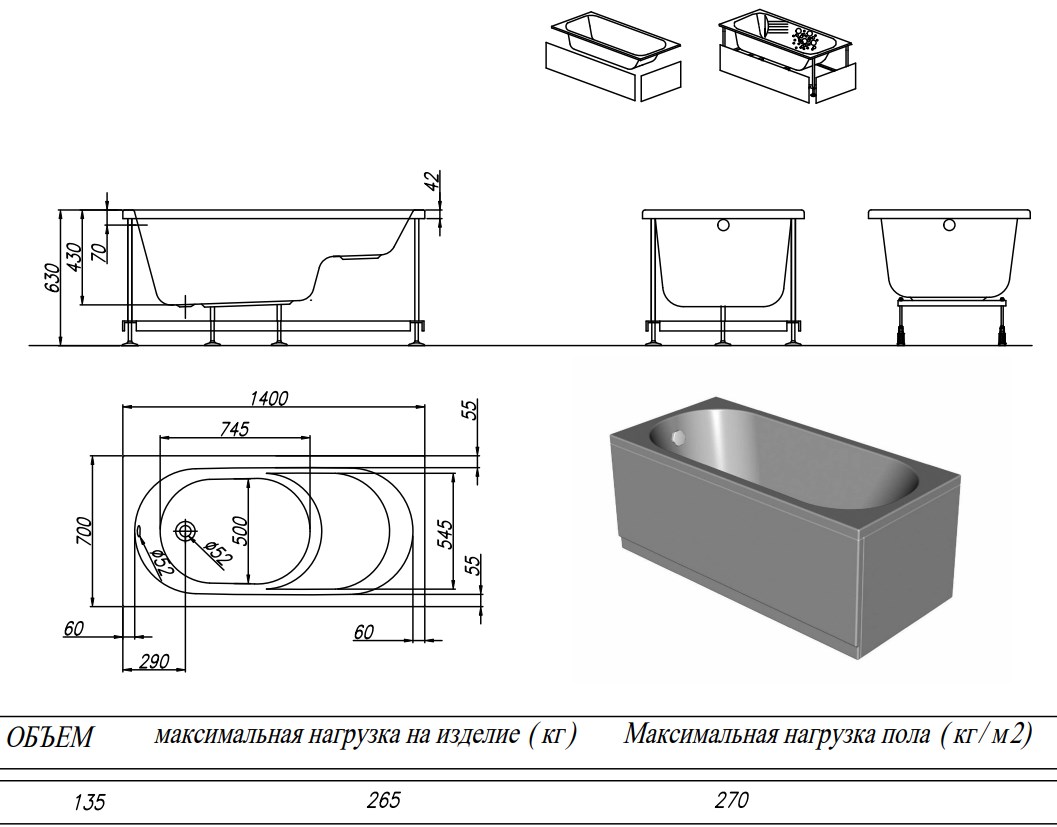 Ванна представлена в 6 востребованных размерах.